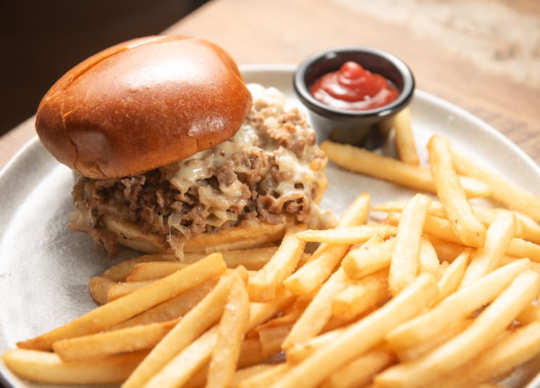 Shaved steak, sweet onions, and melted gouda stuffed in a brioche roll. Served with fries — pure comfort in every bite